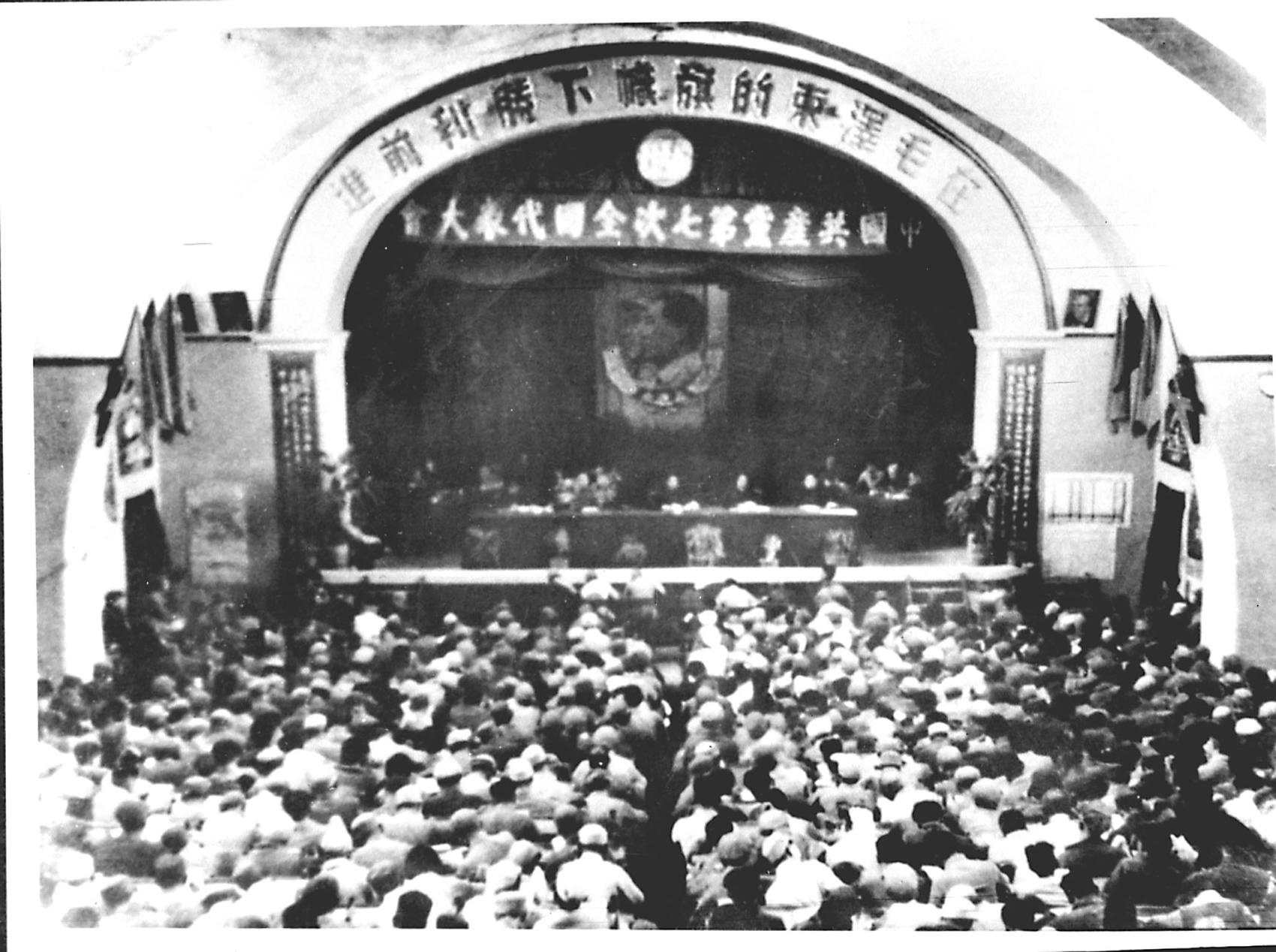 1945年4月,中国共产党第七次全国代表大会在延安召开,毛泽东指出,“我们的党已经成了中国人民抗日救国的重心,已经成了中国人民解放的重心,已经成了打败侵略者、建设新中国的重心”。图为党的七大会场(资料图片)。 延安革命纪念馆供图